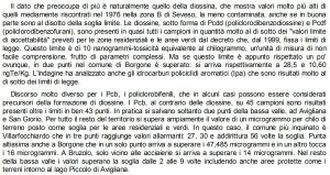 L’intervento dell’Arpa conferma i timori che da oltre trent’anni agitavano gli abitanti della bassa valle. C’è diossina nelle polveri dell’acciaieria, le analisi sono ancora parziali ma i risultati già disegnano un quadro inquietante. L’Arpa fa cinque prelievi e rileva che la quantità di simil diossina (Pcb dioxine like) è di venti volte superiore ai valori di riferimento di allora.