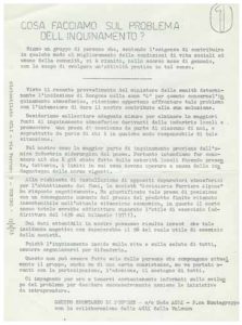 Già nel 1973 la preoccupazione dei cittadini di Borgone, Bruzolo, San Didero, Villar Focchiardo e San Giorio cresce e si iniziano a formare i primi comitati spontanei che chiedono di prendere provvedimenti per i fumi che impestano l’aria della bassa valle. Vengono raccolte oltre 1300 firme e, come raccontato nel documento di ambientevalsusa che abbiamo citato sopra, “l’attività di protesta spontanea […] riesce a coinvolgere i cittadini e i Sindaci degli altri paesi in un’azione tenace che attraverso molte assemblee pubbliche porta prima alla sottoscrizione di un esposto alla Magistratura e, successivamente, all’adozione da parte della Cravetto di Bruzolo (poi Ferrero ed oggi Beltrame) e delle Ferriere Alpine di Borgone (oggi smantellate), dei primi depuratori per il filtraggio a secco dei fumi. Solo molto più tardi, e dopo ripetute azioni di denuncia da parte delle amministrazioni locali, ma anche di privati cittadini, verranno installati dei depuratori più efficienti anche se il loro uso, specialmente nelle ore notturne, apparirà molto frammentario (per poter abbattere gli elevati costi di manutenzione e per migliorare il rendimento degli impianti).”