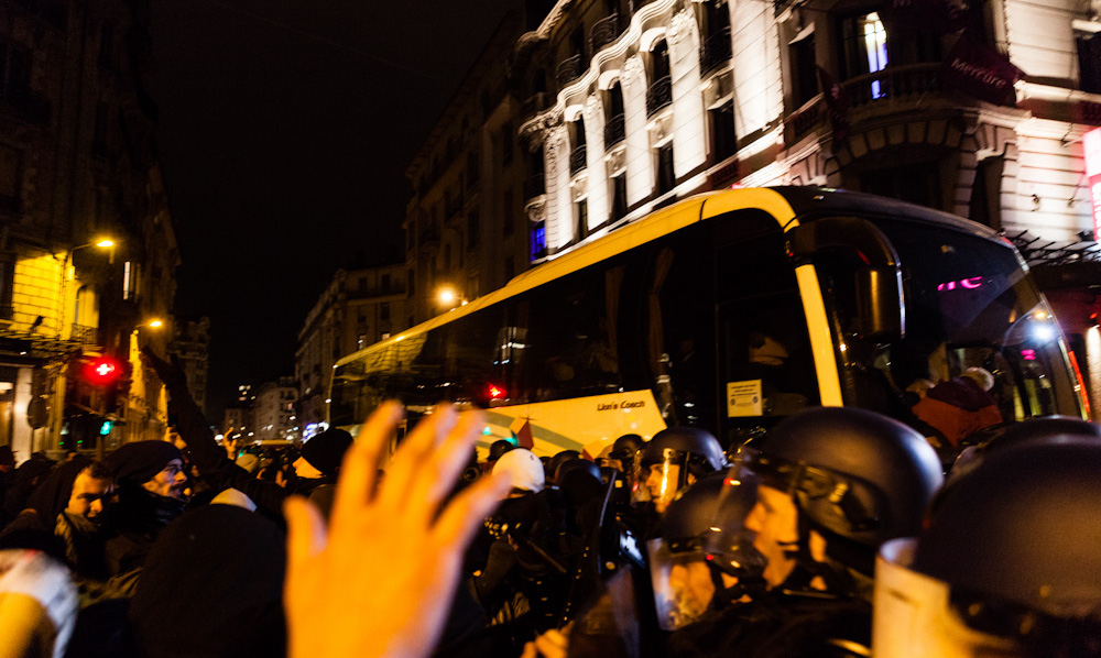 La presenza a Lione è stata confinata in una piazza interamente circondata da mezzi e uomini delle forze di polizia francesi, tanto da impedire il movimento e la libera circolazione oltre tale area (che a più riprese è stato sollecitata da nostri concittadini, ricevendone la risposta che era vietato procedere oltre, puramente e semplicemente).