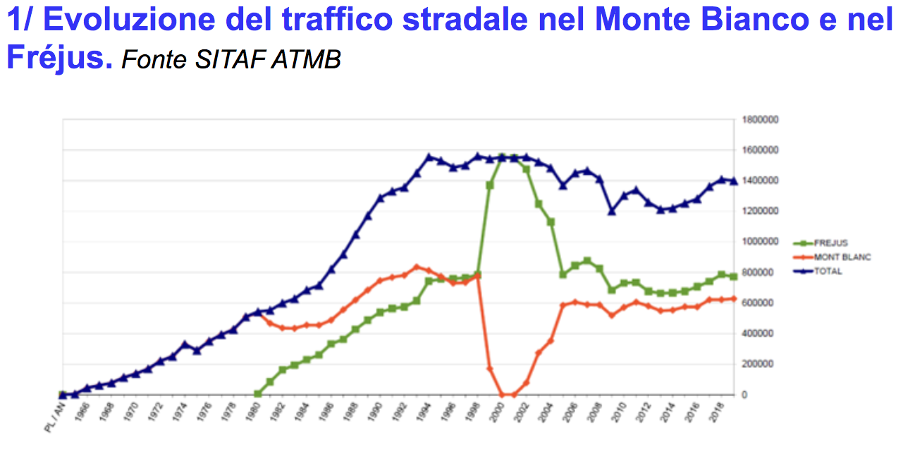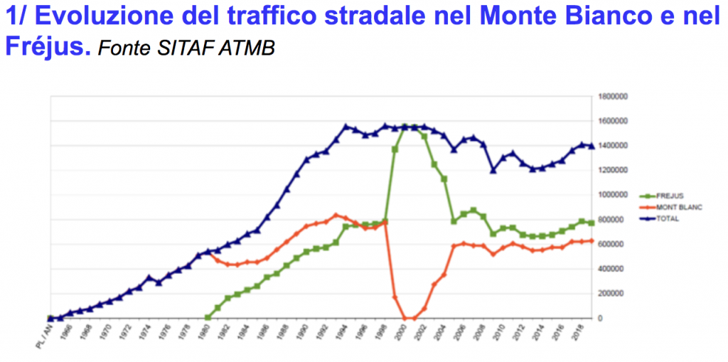Andiamo a ricordare ora gli effetti che avrebbe il TAV nel contesto del già catastrofico inquinamento della zona padana. Prendendo per buoni i dati forniti dall’Osservatorio ministeriale sulla Torino-Lione – organismo di per sé viziato da un’ineliminabile parzialità visti i continui andirivieni dei suoi dirigenti con i posti al vertice della società promotrice dell’opera – lo scavo del tunnel di base causerà l’immissione di un milione di tonnellata di CO2 l’anno nell’atmosfera per tutta la durata del cantiere che, nella migliore delle ipotesi, durerà 15 anni[15]. Un aumento dell’inquinamento mostruoso per la zona metropolitana torinese che TELT sta provando a giustificare dicendo che sarebbe riassorbito negli anni successivi con il cosiddetto shift modale tra gomma e ferro. Anche facendo astrazione del fatto che l’Intergovernmental Panel on Climate Change (IPCC) ha chiarito che ci restano solo 11 anni per evitare che il riscaldamento globale diventi irreversibile, e che quindi in questo lasso di tempo bisognerebbe diminuire le emissioni anziché aumentarle, quanto ci vorrebbe per “recuperare” l’inquinamento prodotto dal tunnel del TAV dopo la sua eventuale apertura? È sempre l’Osservatorio ministeriale che stima che con 12 anni di uso della linea a pieno regime gli effetti inquinanti del TAV dovrebbero essere annullati. Prima del 2047, insomma, non se ne parla. Più importante ancora, perché questo recupero sia possibile, secondo l’Osservatorio servirebbe un aumento del traffico sulla direttrice ferroviaria Torino-Lione di circa 20 volte. Una crescita stratosferica, un dato sparato al di là di ogni principio di realtà visto che i volumi di traffico comunicati dai gestori del tunnel del Frejus e del Monte Bianco parlano, nel 2019, del passaggio di poco meno di 1,4 milioni di TIR, un numero addirittura in discesa rispetto all’anno precedente e di un traffico in sostanziale stagnazione dall’inizio degli anni ’90. Le previsioni di traffico spinte dai costruttori d’altronde sono sempre state smentite dai fatti. Basti pensare che nel 2006 la società promotrice dell’opera stimavano il traffico di mezzi pesanti nel 2017 a 2,7 milioni di veicoli, il doppio quindi di quello attuale.
