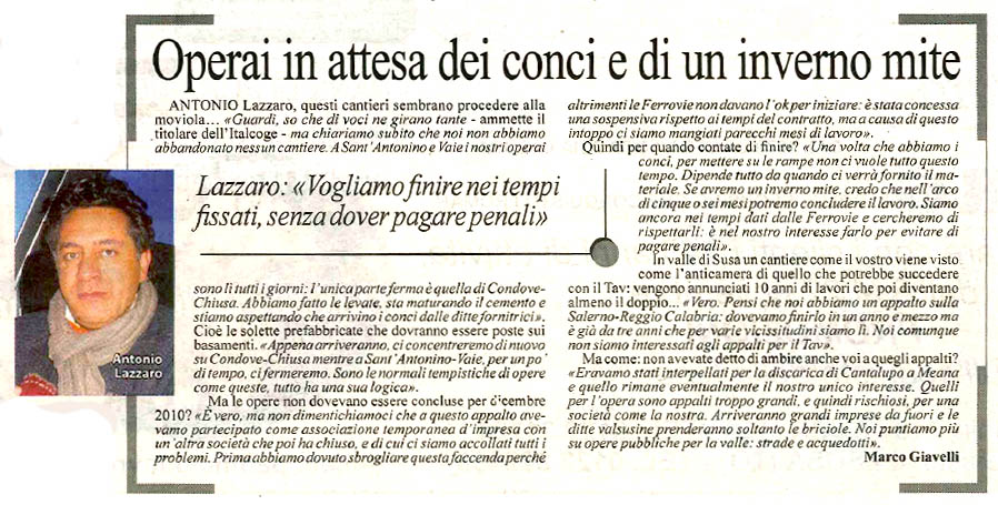 n un intervista publicata sul numero odierno di Luna Nuova, Antonio Lazzaro di ITALGOGE, rispondendo alle domande di Marco Giavelli sui cantieri ferroviari valsusini, a proposito dei ritardi nelle relative realizzazioni dei sovrappassi, oltre a rispondere nel merito delle domande del giornalista ha parlato anche della Tav. Scopriamo con piacere che anche gli imprenditori di settore hanno ben chiaro quale sarà la gestione degli appalti dell’opera. Grandi ditte esterne alla Valle si spartiranno il grosso dei lavori e gli imprenditori locali avranno forse la possibilità di raccoglierne le briciole.