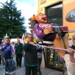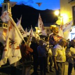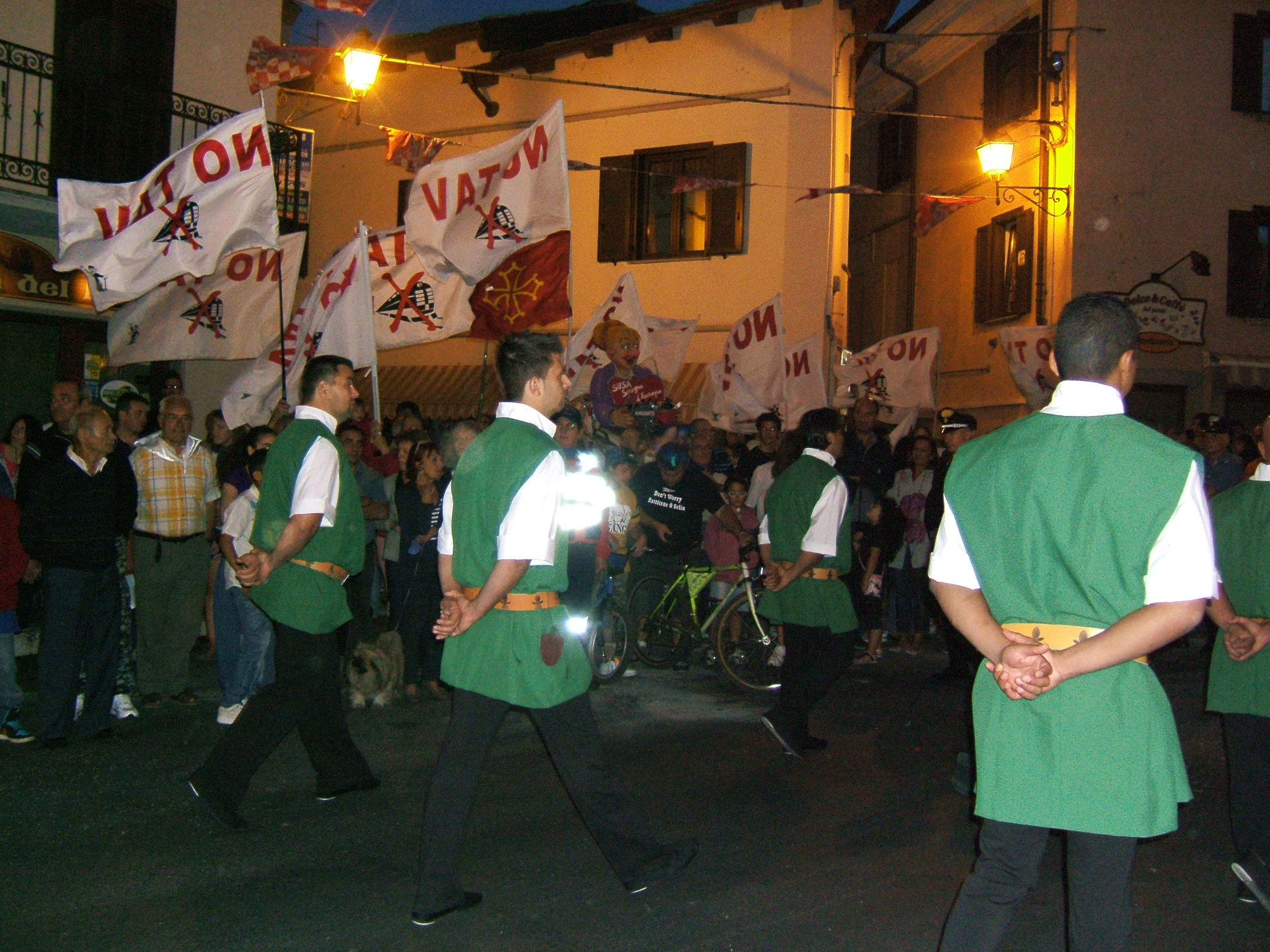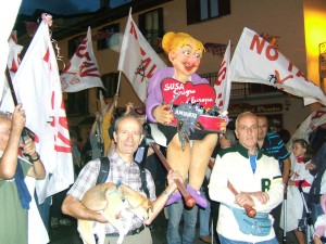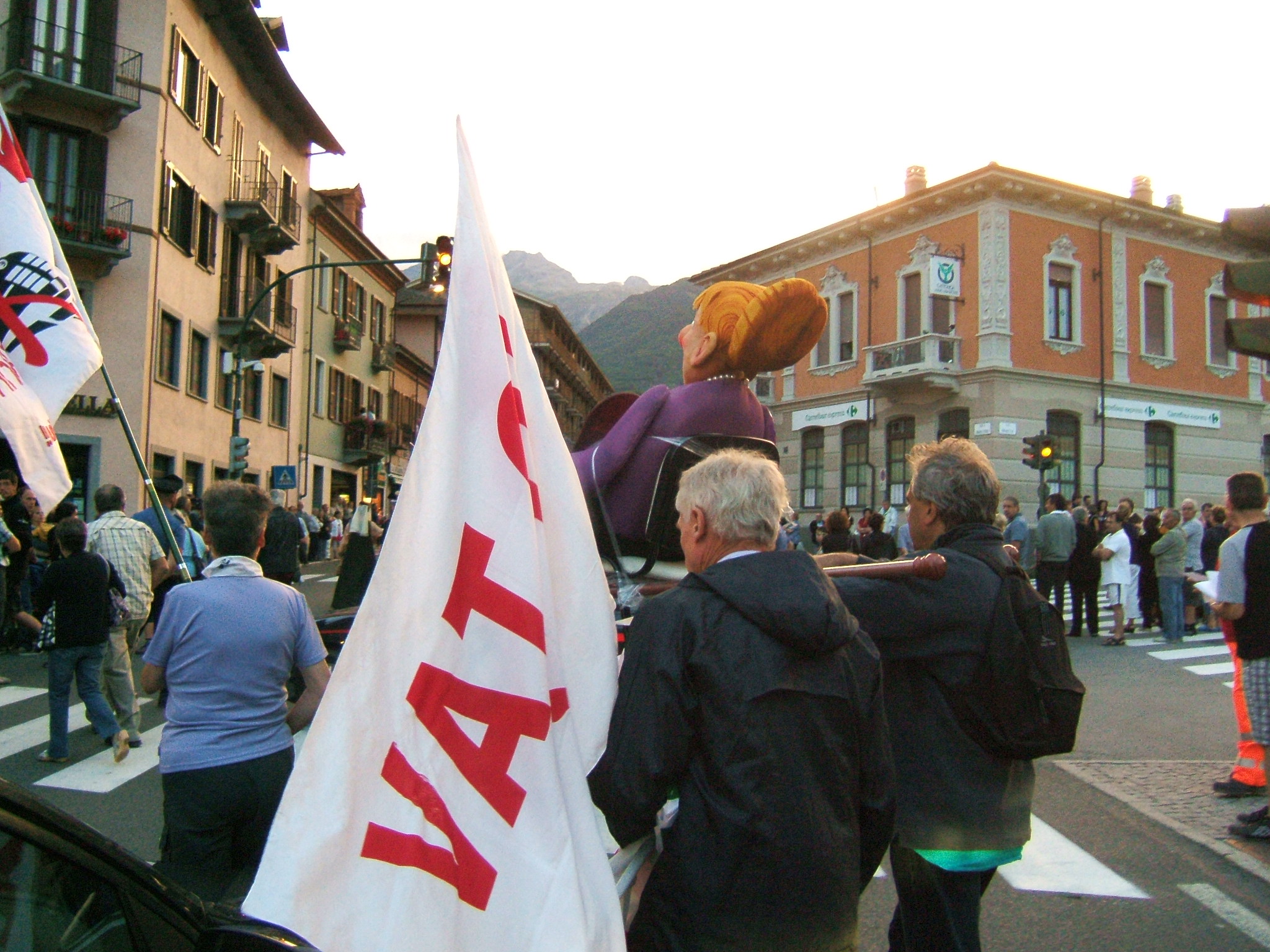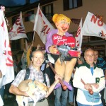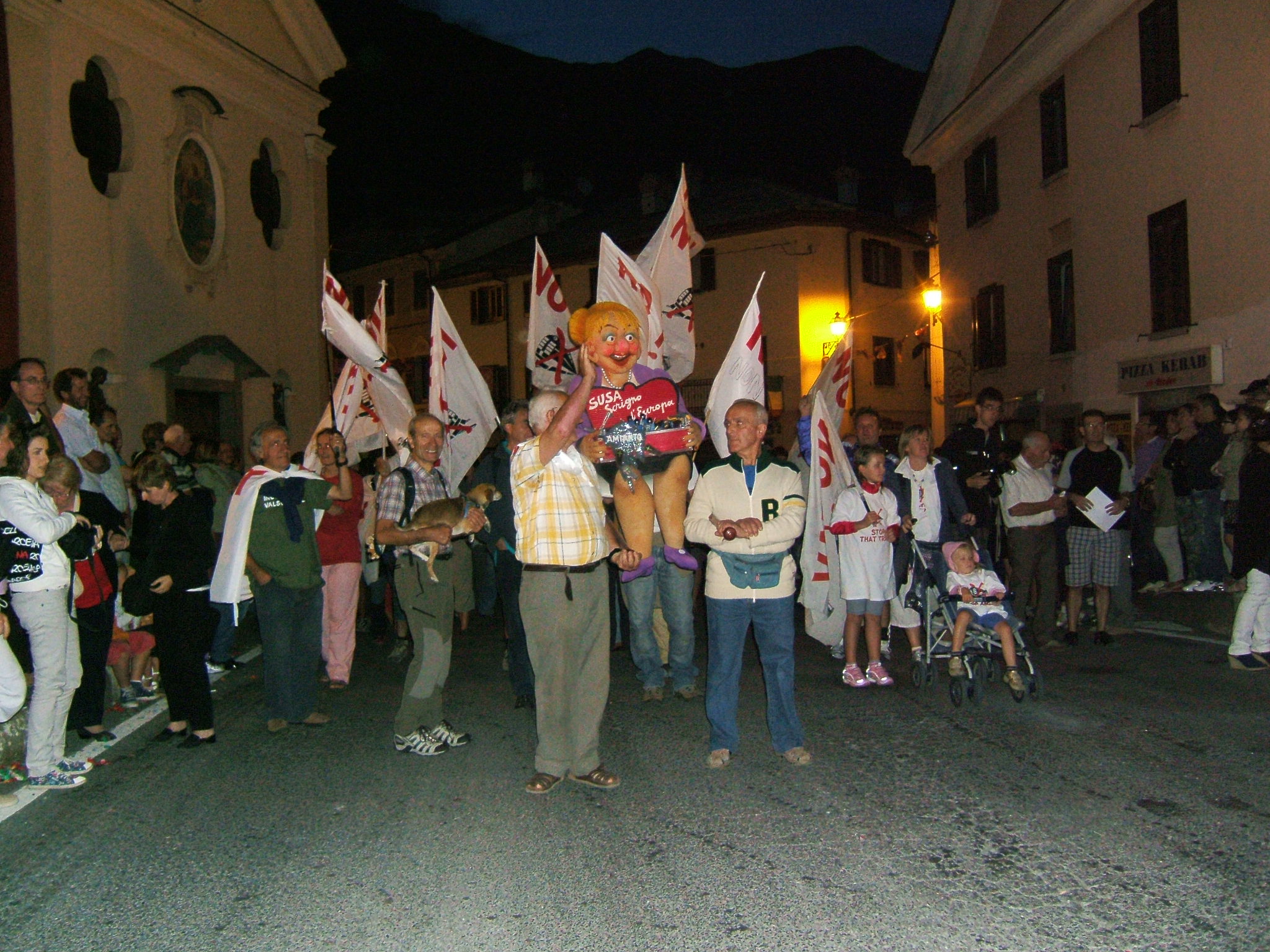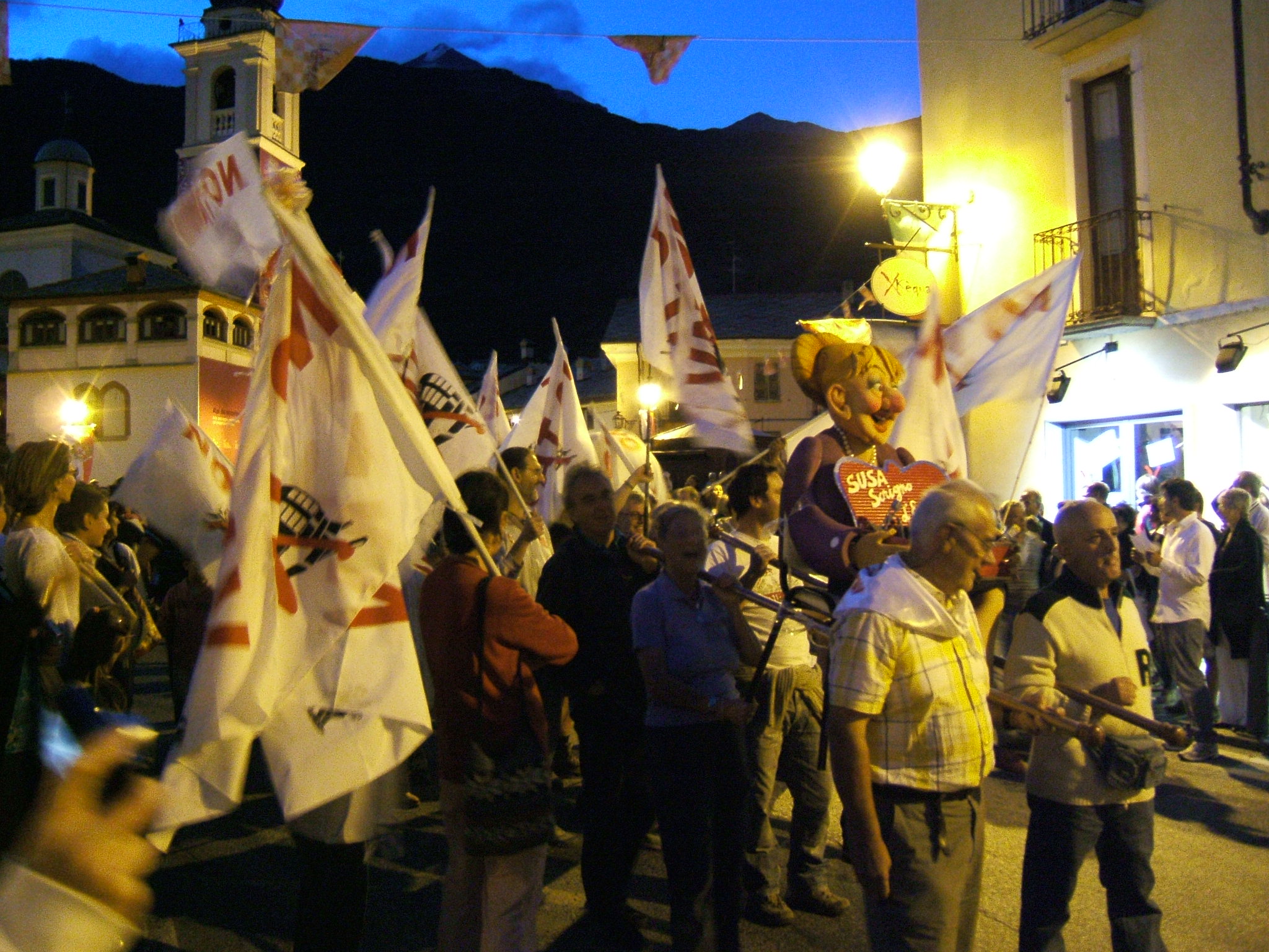 Sabato 23 luglio la venticinquesima edizione del palio di Susa ha visto alla ribalta un invitato straordinario: il borgo della…Maddalena, ovvero il popolo No Tav che si materializza attraverso l’arte di Piero Gilardi. Per protestare contro lo sgombero violento della libera repubblica della Maddalena e la militarizzazione di Chiomonte e dintorni un gruppo di attivisti No Tav, torinesi e valligiani, coordinati dal comitato di Susa-Mompantero, ha pensato bene di portare in corteo, dopo i regolari figuranti dei borghi segusini, il pupazzo in gommapiuma che rappresentava la caricatura del sindaco di Susa, rimasta celebre (si fa per dire, constatata la sua fatua inconsistenza politica e culturale…) per la dichiarazione su “Susa scrigno d’Europa”! In grembo alla pupazza c’erano i doni della occupazione militare: lacrimogeni, ruspe, amianto e relative casse da morto prodotte dallo scempio ambientale. La folla sul ponte centrale della cittadina e nel centro storico ha applaudito divertita e si è unita agli slogan “Giù le mani dalla Valsusa! – Fuori le truppe di occupazione!”. Poi i manifestanti No Tav hanno concluso la loro performance con foto di gruppo davanti al municipio, mentre il resto dei figuranti confluiva naturalmente all’arena. Che dire? Una bella serata resistente che verrà ricordata negli annali del folklore segusino.