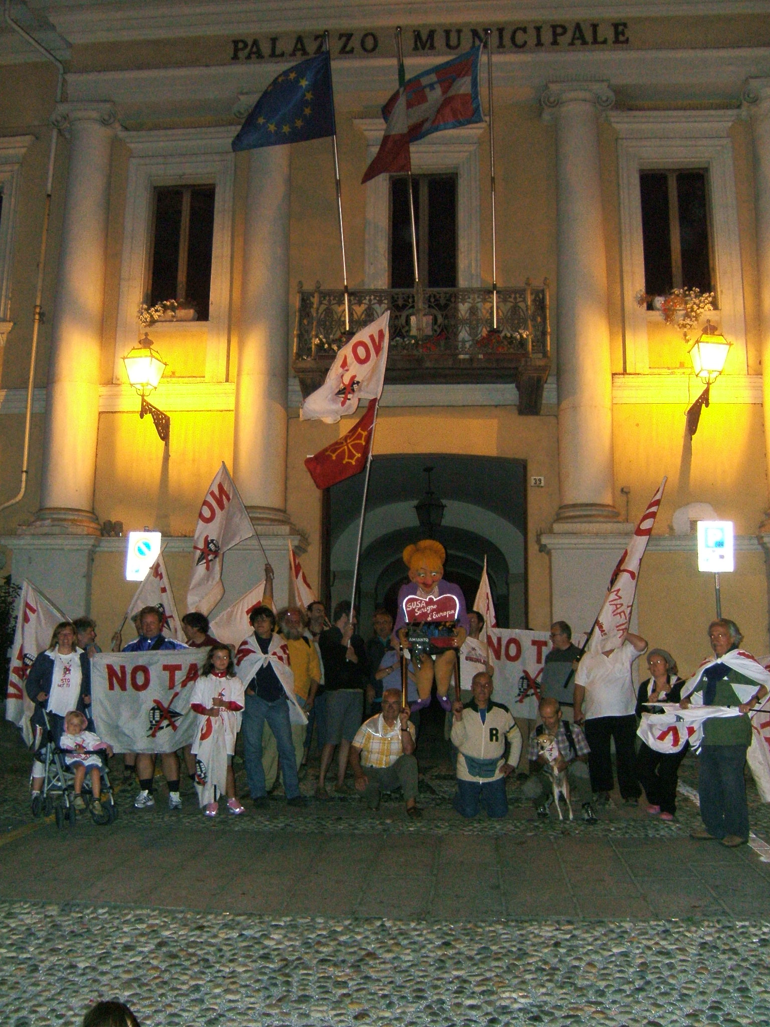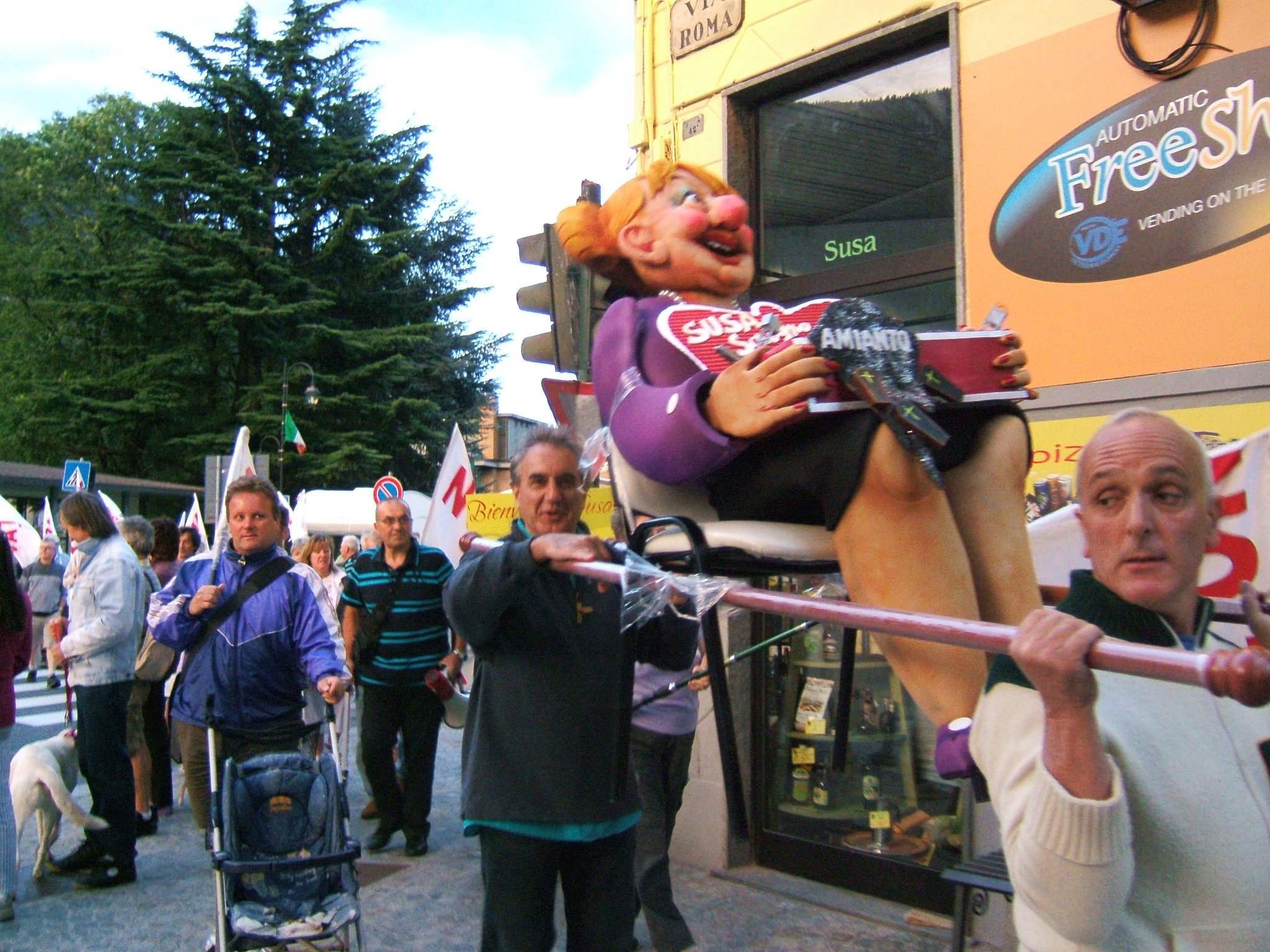 Sabato 23 luglio la venticinquesima edizione del palio di Susa ha visto alla ribalta un invitato straordinario: il borgo della…Maddalena, ovvero il popolo No Tav che si materializza attraverso l’arte di Piero Gilardi. Per protestare contro lo sgombero violento della libera repubblica della Maddalena e la militarizzazione di Chiomonte e dintorni un gruppo di attivisti No Tav, torinesi e valligiani, coordinati dal comitato di Susa-Mompantero, ha pensato bene di portare in corteo, dopo i regolari figuranti dei borghi segusini, il pupazzo in gommapiuma che rappresentava la caricatura del sindaco di Susa, rimasta celebre (si fa per dire, constatata la sua fatua inconsistenza politica e culturale…) per la dichiarazione su “Susa scrigno d’Europa”! In grembo alla pupazza c’erano i doni della occupazione militare: lacrimogeni, ruspe, amianto e relative casse da morto prodotte dallo scempio ambientale. La folla sul ponte centrale della cittadina e nel centro storico ha applaudito divertita e si è unita agli slogan “Giù le mani dalla Valsusa! – Fuori le truppe di occupazione!”. Poi i manifestanti No Tav hanno concluso la loro performance con foto di gruppo davanti al municipio, mentre il resto dei figuranti confluiva naturalmente all’arena. Che dire? Una bella serata resistente che verrà ricordata negli annali del folklore segusino.VIVA IL SINDACO DI SUSA!