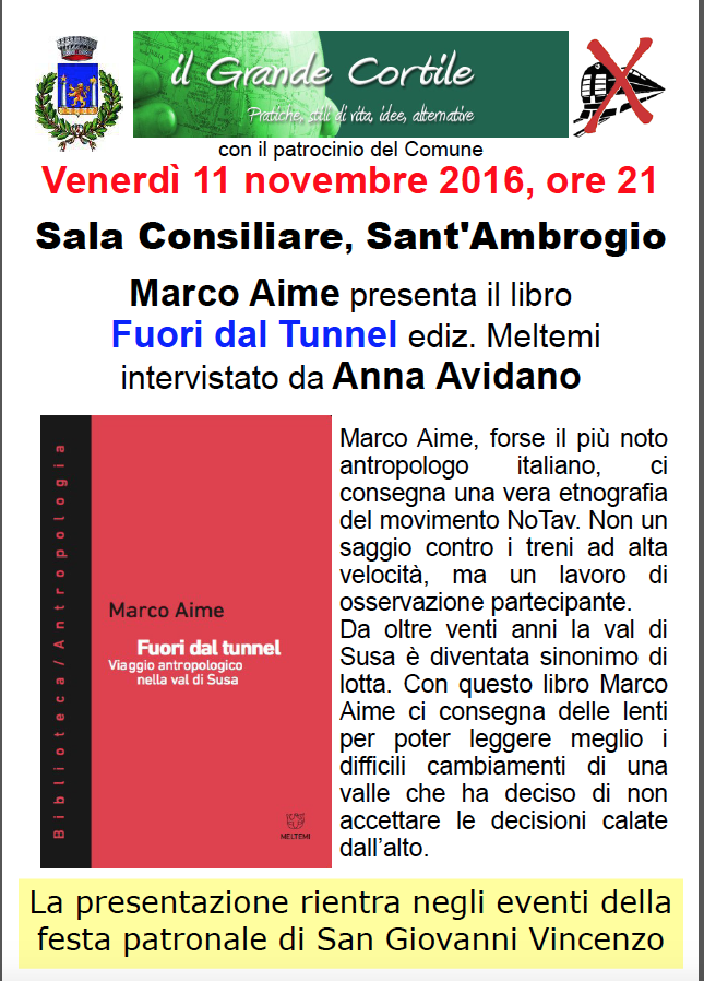 Venerdì 11 Novembre 0re 21 Sant’Ambrogio Sala consiglio Marco Aime presenta: Fuori dal tunnel, viaggio antropologico nella val di Susa, ed Meltemi Con Anna Avidano, antropologa Altri appuntamenti […]