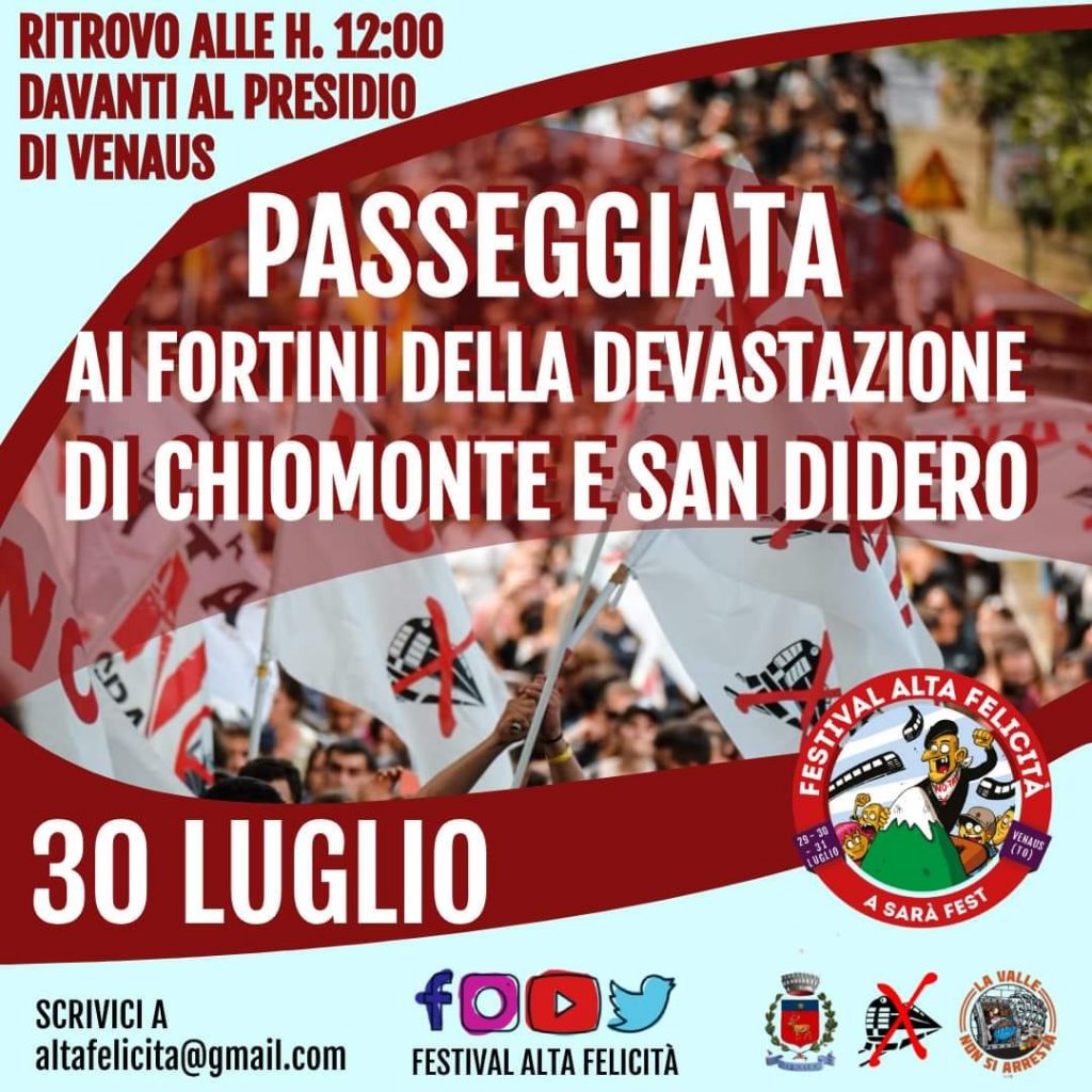 Domenica 30 luglio, all’interno della tre giorni del Festival Alta Felicità, il Movimento No Tav vi da appuntamento alla passeggiata ai fortini della devastazione di Chiomonte e San Didero. Un’appuntamento […]