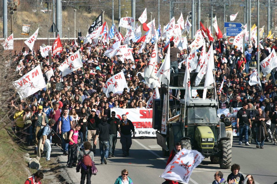 h 14 – La testa del corteo, aperto dalla Comunità Montana e dai parenti degli arrestat*, è appena uscito dal paese. Decine di migliaia di persone in corteo, provenienti da tutta Italia. Treni affollatissimi da Milano e Genova. Molti pullman da Bologna, Pisa, Roma, e il resto del paese. Presenti anche alcune bandiere greche in solidarietà col popolo colpito dall’austherity.