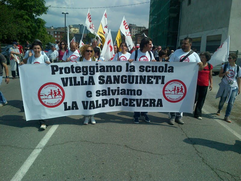 paesino della val borbera in provincia di Alessandria. Tantissime bandiere notav portate dalla gente dei comitati venuti anche dalla vicina Novi Ligure, giovani e meno giovani, ancora una volta come in Valsusa tre generazioni scendono in piazza per difendere il loro territorio che rischia di essere devastato dal cantiere dell’alta velocità. Apre il corteo il trattore con rimorchio del comitato della frazione Rigoroso, dove è presente una falda acquifera che porta l’aqua a tutti i paesi della zona, e dove gli ingegneri del tav hanno deciso di far passare la ferrovia. “Ad Arquata come a Chiomonte” urlano i ragazzi del locale comitato, preaguruando il blocco del cantiere anche nel basso piemonte. Dal versante ligure importante la testimonianza del comitato genitori-insegnanti della Valpolcevera la cui scuola “villa sanguinetti”, sarà chiusa per diventare un ufficio tecnico dell’alta velocità, con annesso cantiere nel loro territorio.