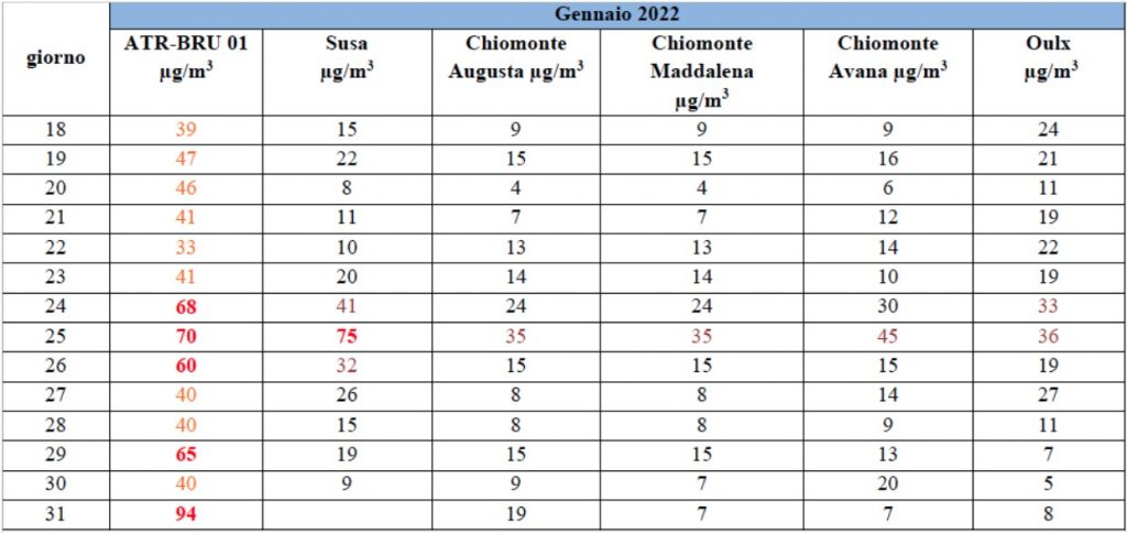 I valori registrati a Bruzolo sono sistematicamente più alti rispetto a quelli di Susa e vi sono numerosi superamenti delle soglie stabilite da Sitaf così come dei limiti per la protezione della salute umana stabiliti per legge, per non parlare di quelli indicati dall’OMS.