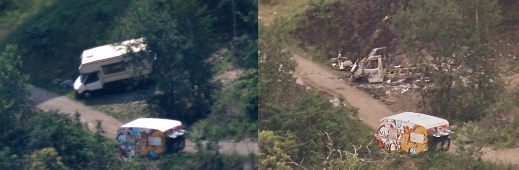 In basso si possono vedere le immagini del camper no tav scattate in sequenza ieri domenica 3 luglio e oggi lunedì 4 luglio. Si possono vedere il camper integro e i resti dello stesso nella medesima posizione. Oggi lunedì 4 luglio alle ore 14.40 una colonna di fumo si è alzata dalla valle Clarea, interamente presidiata e circondata dalle forze dell’ordine proprio durante la conferenza stampa organizzata dal movimento in merito ai fatti avvenuti ieri e alle violenze della polizia. Il camper era stato acquistato con le donazioni di tutti i no tav della valle anni fa ed era stato in questi anni usato dal movimento per presidiare in maniera permanente ed efficace il territorio. Da anni il comitato di lotta popolare di Bussoleno se ne prendeva cura e proprio per questo, come simbolo, è stato dato alle fiamme. Dopo gli incendi dei presidi di Borgone e Bruzolo, i proiettili, le lettere minatorie con il veleno ancora una volta un atto grave fatto dalla lobby del tav in val di Susa sotto l’occhio attento e protettivo della polizia in una valle isolata e militarizzata. Oggi pomeriggio il movimento ha già visionato altri camper da poter acquistare e a breve, tempi burocratici per l’acquisto permettendo ne acquisterà un altro. Inoltre i filmati delle webcam poste a sorvegliare il presidio baita Clarea e il pilone in pietra stanno per essere visionati e sicuramente seguiranno interssanti sviluppi. Intanto regolare denuncia è stata fatta dall’intestatario del mezzo con la testimonianza di un consigliere comunale che ieri aveva visto il camper integro. Non sarà certo un vile atto intimidatorio a fermare un movimento che saprà sicuramente rispondere a testa alta.