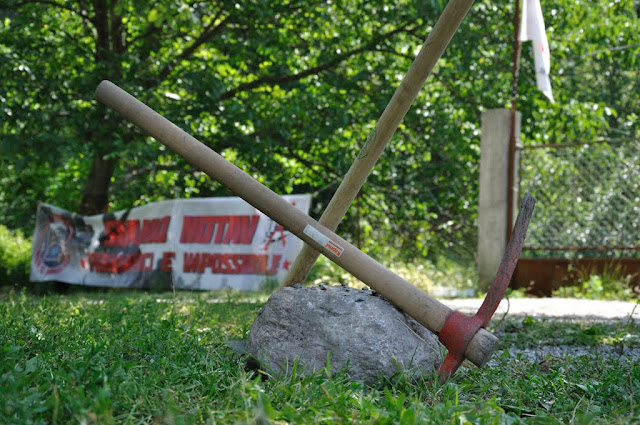 Siamo al secondo giorno di campeggio studentesco no tav a Chiomonte e il bilancio non può che essere positivo. Nella giornata di ieri venerdì 15 giugno abbiamo ultimato i lavori di preparazione delle strutture di accoglienza e così si è potuto inziare con una cena collettiva che ha permesso a tutti di iniziare un buoin dibattito. In una partecipata assemblea si è potuto così iniziare a discutere il programma di lotta, calibrato sulle istanze e le volontà di tutti i giovani campeggiatori. Come primo appuntamento si è così pensato nel dopo cena di procedere con una battitura presso il vicino cancello della centrale elettrica che di fatto costituisce il primo illegale presidio delle forze di polizia. Le reti e i cancelli del fortino sono stati individuati come primi obiettivi della lotta del campeggio, abusive, non volute dalla popolazione, recinto per un cantiere che non deve assolutamente iniziare. Una completa continuità quindi con la lotta che per un intero anno ha visto il movimento no tav impegnato a Chiomonte. Questa mattina sono proseguiti i lavori di preparazione per la giornata di oggi sabato 16 giugno. Alle ore 15 è inizata poi l’assemblea popolare delle realtà studentesche presenti. Un momento per confrontarsi al di là dell’immediato con chi da ogni parte d’Italia è venuto oggi a Chiomonte e ha seguito per un intero anno le mobilitazioni dalle proprie città. Punti di vista differenti, da differenti metropoli e territori che trovano nella lotta no tav un interessante momento di unità. Ecco quindi gli appuntamenti per i prossimi giorni, da subito stasera un’altra azione di disturbo nel dopo cena. Domani domenica 17 giugno la pulizia dei sentieri che permettono l’avvicinamento durante le azioni di lotta alle recinzioni dalle ore 11. Nel pomeriggio per tutti l’appuntamento è in val Clarea, partendo dal campeggio insieme portandosi il pranzo al sacco. Domani sera di nuovo ci saranno momenti di festa e lotta. Rinnoviamo quindi l’invito a tutti a partecipare e a seguire le varie iniziative che saranno proposte.