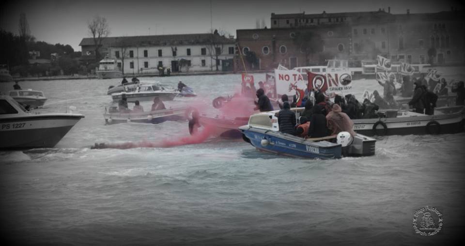 Sono due ore di scontri in mare, cercando di andare “dall’altra parte”. A tentare di arginare la mobilitazione, la questura di Venezia ha schierato mezzi e uomini che stupiti si chiedono il perchè, dove si voglia andare. Questa purtroppo è una sorpresa che nella giornata non si è potuta svelare nonostante l’impegno di donne e uomini di ogni età con a disposizione i loro corpi dentro mezzi da lavoro prestati con generosità alla causa. Dall’altra parte con naturalezza sarebbe successo quello che da tempo il mondo si aspetta, un bel calcio nel sedere e un cambio di rotta e di vita a chi da troppo tempo ormai gioca con le sorti del pianeta stesso e delle vite che lo attraversano. Non c’era il “mondo” da questa parte, era una giusta e misurata mobilitazione che con serietà ha provato a lanciare ancora una volta un messagio, un reale momento contro.