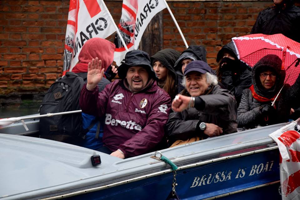 Bagnati ma felici nel pomeriggio insieme si rientra verso casa, ripercorrendo canali e calli verso piazzale Roma. Intanto, tornando a Palazzo Ducale iniziano a trapelare le “novità”. Sulla guerra, pronti, ma neanche troppo, sulle frontiere, chiudiamo ma con moderazione, sulla tav,, avanti come sempre. Insomma niente di nuovo. Le dichiarazioni sono di cortesia come le immagini, tanta scena e niente politica, solo facciata per tranquillizzare gli investitori e i banchieri. Chi è giunto da lontano intanto riprende la strada di un viaggio iniziato la notte precedente che al tempo stesso nell’impegno prosegue ormai da anni. Anche qui sono le emozioni che rimangono e ci sono equipaggi improvvisati che con rispettoso fare montanaro cercano i loro “capitani” di vascello e timonieri per una bevuta, un’ombra come si usa in idioma locale. Sono culture che si incontrano in modo semplice e con naturalezza scorrono, vita vera, quella che vorremmo portare con forza oltre i confini e le grandi opere inutili.