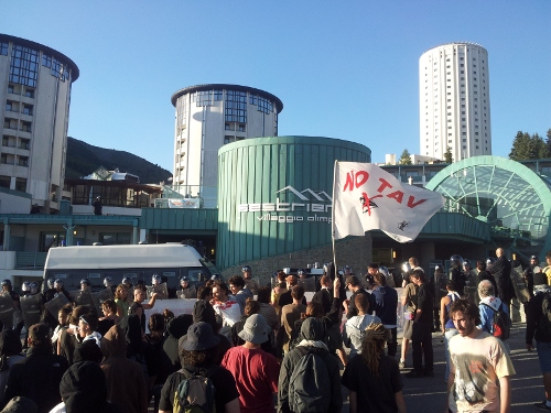 Dopo una serie di interventi al megafono che hanno spiegato ai villeggianti nel complesso alberghiero il perchè della contestazione, si è lanciato un messaggio chiaro alle truppe d’occupazione accorse sul luogo con l’affanno: fuori le truppe d’occupazione dalla Val di Susa!