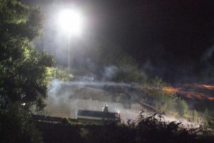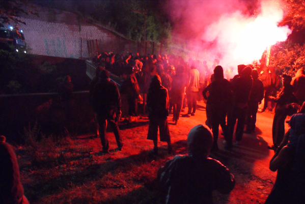 Un dj set continuo con artisti locali e non con cori di lotta vecchi e nuovi. Dopo la cena è di nuovo l’ora di ripartire, un intermezzo nel concerto scandisce il tempo e i no tav si dirigono al cancello del cantiere presso la centrale elettrica di Chiomonte. Qui il ponte di accesso che attraversa la Dora è bloccato con i new jersey e le reti. Arriva anche l’idrante della Polizia e dopo circa una decina di minuti di battitura rumorosa parte la risposta con i gas. L’aria diventa irrespirabile da subito e per metà l’area del campeggio viene investita dai gas lasciando però un ampio spazio libero dove continuerà poi la serata musicale. Per oltre un’ora i giovani continueranno a premere al cancello e a resistere ai gas. A riprendere il concerto gli Assalti Frontali che con la loro musica chiudono la prima porzione di serata, a seguire, per tutta la notte lo spazio è per la musica elettronica. Finisce così un fine settimana di lotta, tra musica e gas, resistenze di ieri e di oggi in un’estate di lotta no tav ancora agli inizi.