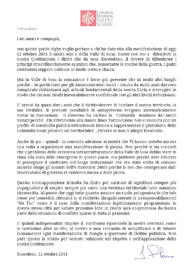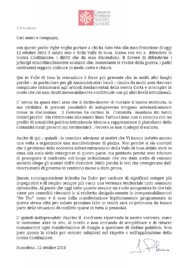 Lettera di Sandro Plano per la manifestazione del 12 ottobre a Roma