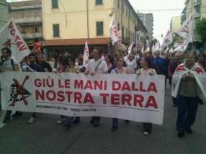 ore15: Il corteo, aperto da uno striscione che recita ‘Giù le mani dalla nostra terra’, è appena partito!