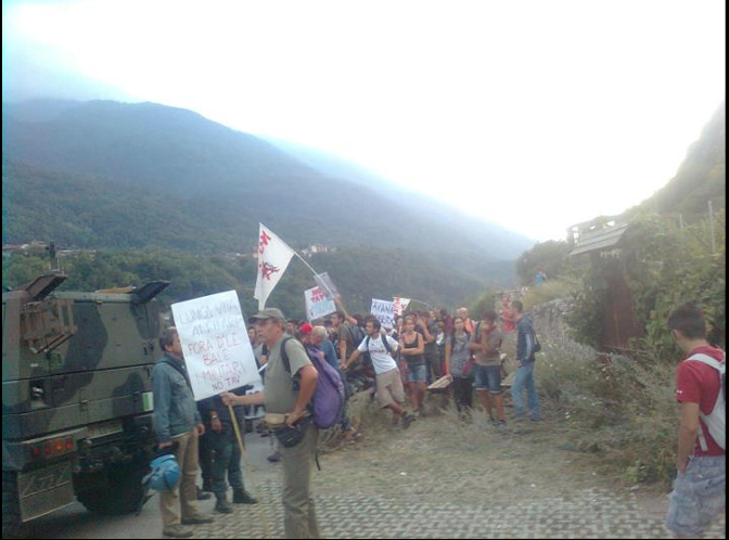 Ore 19.29: il corteo è partito. Dapprima diviso in due spezzoni, uno per i sentieri e uno sulla strada dell’Avanà, si è ora ricompattato all’altezza del Bed and Breakfast. La strada è sbarrata da un mezzo blindato degli alpini e dietro polizia e carabinieri in assetto antisommossa. Tra gli slogan più gettonati “gli alpini di Kabul, andate a fare in cul!” e “cacciatori di Calabria, prendetevi la scabbia!” oltre, ovviamente, quelli storici del movimento come il sempre verde “Giù le mani dalla Val Susa!”