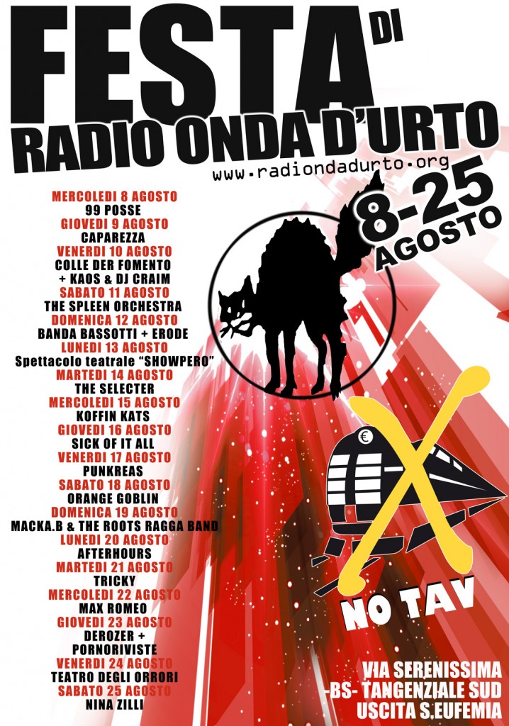 Vi proponiamo una trasmissione con collegamenti dall’area feste per fare il punto della situazione a poche ore dal via alla Festa di Radio Onda d’Urto, principale fonte di autofinanziamento e momento di confronto politico e sociale della nostra (e soprattutto vostra) emittente antagonista: