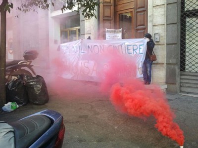 Dopo essere entrati nella sede della Cooperativa gli attivisti hanno messo in scena un breve spettacolo teatrale che aveva come obbiettivo quello di denunciare le modalità di assegnazioni dell’appalto alla CMC, ma soprattutto l’inutilità dell’opera pubblica.