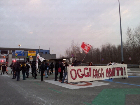 Oggi sabato 3 marzo la val di Susa ha dato la prima risposta al governo Monti che con una vuota e terrificante conferenza stampa ha dichiarato di voler continuare con determinazione nel progetto tav Torino Lione. Da lunedì 27 il movimento no tav ha iniziato una mobilitazione permanente in seguito alla grave tragedia che ha colpito Luca e con lui tutta la valle. Altri terreni sono stati occupati militarmente e altre truppe occupano Chiomonte. Una prova di forza chiara alla quale il movimento non si è sottratto e con intelligenza ha deciso di rispondere. Da lunedì a giovedì i no tav hanno occupato l’autostrada A32 Torino Bardonecchia che viene usata dai mezzi delle forze di polizia per raggiungere Chiomonte. Sono seguite cariche scontri e feriti. Oggi il movimento ha deciso di ritornare su questa arteria gestita dalla società Sitaf, anch’essa complice dell’affare tav Torino Lione. Un ritorno particolare, tutto no tav e opposto alle giornate passate, oggi in val di Susa si passa gratis. Visto il numeroso flusso turistico verso l’alta val di Susa il movimento ha deciso di liberare i caselli attraverso i quali viene pagato il pedaggio alla sitaf. Oggi per passare in val di Susa non si paga, paga Monti, lui in persona si è presentato ai caselli con un grande mascherone a dare il via libera alle auto. In contemporanea a questa iniziativa svoltasi presso il casello di Avigliana da Bussoleno si è mosso un corteo di migliaia di persone verso lo svincolo autostradale di Chianocco della medesima arteria autostradale presso il quale si era svolti i gravi fatti di mercoledì 29. Qui da due giorni gli svincoli erano ostruiti dai famosi new jersey, barriere di cemento che impedivano l’accesso alle auto. Anche qui il corteo ha liberato il transito alle auto. Tutti in coro ancora “OGGI PAGA MONTI !”. Un corteo senza paura che è tornato sui luoghi in cui il movimento aveva subito le dure cariche di mercoledì notte che ribadisce come i tempi, i modi e i luoghi della protesta in val di Susa non li detta il governo ma i valsusini. Tutti soddisfatti dell’ottima giornata, tutti pronti a tornare domani, domenica 4 marzo in val Clarea.