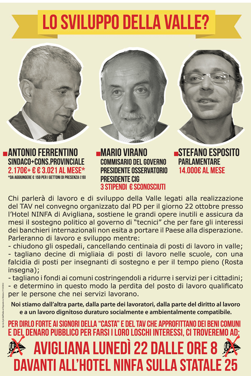 Chi parlerà di lavoro e di sviluppo della Valle* legati alla realizzazione del TAV nel convegno organizzato dal PD per il giorno 22 ottobre presso l’Hotel NINFA di Avigliana, sostiene le grandi opere inutili e assicura da mesi il sostegno politico al governo di “tecnici” che per fare gli interessi dei banchieri internazionali non esita a portare il Paese alla disperazione. Parleranno di lavoro e sviluppo mentre: