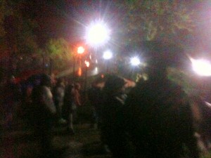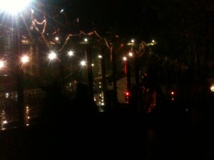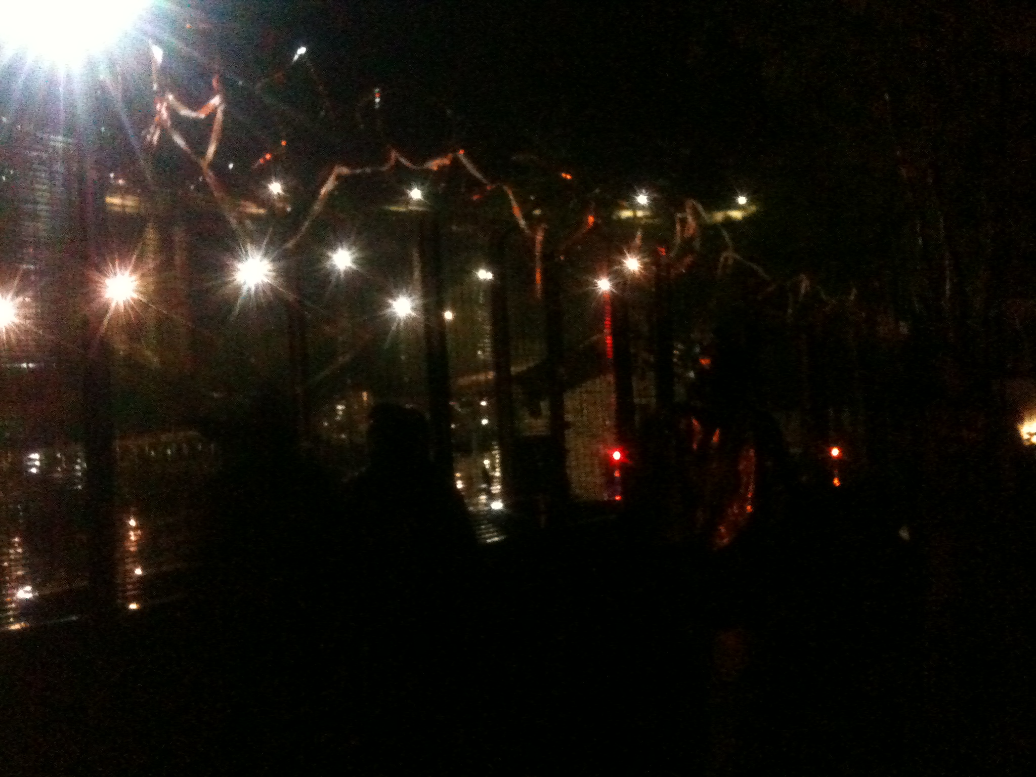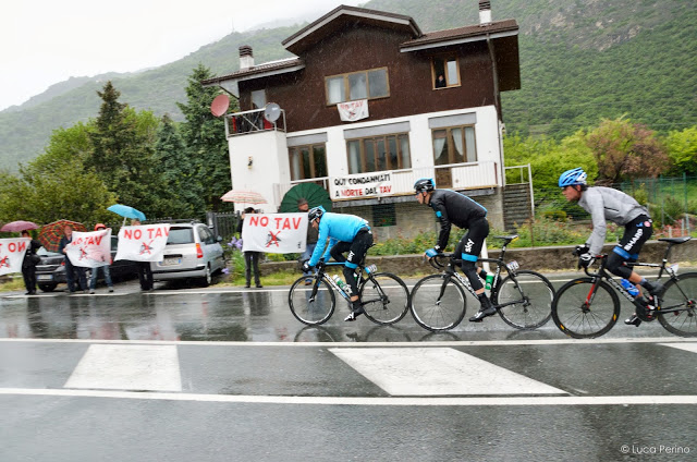 SABATO 18 MAGGIO Il primo giorno di campeggio è andato, dopo una notte passata presso il presidio di Venaus, sempre comodo e accogliente iuniziano i preparativi per la giornata. Si fa la spesa e si prepara il forno, Michele e Biagio, sapienti e pazienti presidianti organizzano, fungono da centralino per le informazioni ai no tav in arrivo e aprono la loro bella e resistente casa. Per chi arriva oggi (molti ragazzi nonostante la pioggia sono continuati a giungere da Torino, Milano, Roma, anche dalla Sardegna) lo spettacolo è bellissimo, i prati sono verdissimi e dopo la molta acqua caduta l’orto sembra crescere a vista d’occhio. Quest’anno il presidio, punterà all’autosufficenza alimentare, le galline, gli orti, le tante verdure piantate serviranno per i presidianti e per i molti ospiti. Alle tre del pomeriggio l’appuntamento viene annulato, causa maltempo e giro d’Italia. Le strade sono chiuse e molte bandiere attendo i ciclisti in questa tappa improvvisata attraverso la valle di Susa. Al presidio però non ci si ferma, si puliscono le verdure e si asciuga la legna per il forno delle pizze, l’impasto invece era già pronto dal giorno prima. In arrivo per la cena anche un gruppo di ciclisti che segue in modo critico il giro d’Italia, a favore di un altro sport, libero, non mercificato, senza il doping e dunque quale posto migliore per fare “tappa” se non un presidio no tav? Il pomeriggio passa così, tra preparativi e partite a carte, discussioni e risate. Alle 19 escono le prime pizzette dal forno per l’aperitivo, ottime e fino alle 20 con una continuità degna di una pizzeria napoletana si prosegue in allegria. Alle 20 è pronta la pasta e con un buon bicchiere di vino di Bussoleno offerto da Tommaso ci si prepara all’iniziativa verso il cantiere. Le previsioni parlano chiaro, sabato 18 ore 21 picco massimo di precipitazioni. Si parte lo stesso e alle 21.30 una trentina di no tav con le macchine raggiungono Giaglione e poi ancora da lì a piedi verso il cantiere. Lo spettacolo della val Clarea di notte è a dir poco sconvolgente, luci e fari che iluminano a giorno una superficie complessiva di oltre 70000 metri quadri, reti e filo spinato, muri, cancelli, luci blu, blindati militari, caschi, idranti. Tutto è pronto per l’arrivo dei no tav, almeno un centinaio di carabinieri, poliziotti e alpini attendono agitati la comitiva. Qualche urlo ma nulla di più, molti giri attorno alle reti e con molta calma tanti no tav arrabbiati e determinati che prendono le misure del mostro. Misure non in metri o centimetri, non in euro spesi ma misure di resistenza, reazione delle truppe agli spostamenti, capacità di movimento sul campo, tempi, agibilità dei sentieri. Il tutto dura un’oretta circa, sempre sotto una pioggia battente. Primo bilancio tra le chiacchiere al ritorno: positivo. Le recinzioni sempre più larghe e nessun aiuto reale giunto come rinforzo alle truppe presenti fanno pensare ad un buon tipo di agibilità per le future azioni di disturbo.