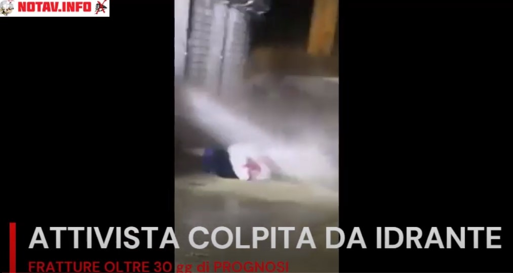 La dura e violenta ondata d’acqua, come si vede perfettamente nel filmato, l’ha subito scaraventata in terra, ma evidentemente ai solerti amanti della violenza impunita non è bastato agire su una donna che altro non faceva che provocare un po’ di rumore, visto che l’idrante ha continuato a infierire sulla signora per diversi secondi.